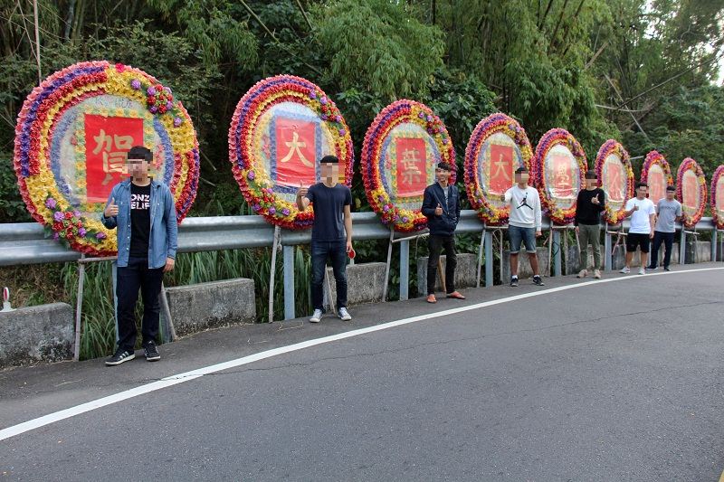 大葉大學門口今天上午出現一排花圈,遠望以為是有人辦喪事,細看花園上寫的卻是祝人生日快樂,讓過生日的當事人哭笑不得。而超顯眼的排場也被人拍下並分享到臉書社團「爆料公社」,引來許多網友熱烈討論,直呼這名幸運兒「不紅也難!」