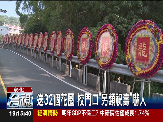 不是運動會,也不是什麼重大日子,大學校門口竟然擺了長長一排祝賀花圈一個花圈一個字,賀 大葉大學人力資源暨公共關係學系,陳俊龍同學生日快樂,鹽水親友團敬賀,落落長總共32個花圈,讓人不禁聯想,這陳俊龍倒底是何方人物,過個生日,排場弄這麼大他,就是主角-陳同學,早上睡醒,從網路上看到這畫面,第一時間很傻眼,而送禮的,是陳同學認識4、5年的好朋友16位台南的好朋友一起集資送花圈,過去在台南鹽水抬轎班認識,對於生日送花圈,學校老師同學都覺得很有創意這整排花圈,1對2個要價400元,16對6千400元,陳同學說,18歲生日時,曾經收到罐頭塔當禮物,還被綁在樹幹上,被朋友砸刮鬍泡這回20歲生日,朋友突發起想送花圈,想必讓壽星永生難忘