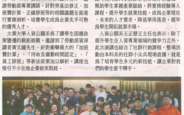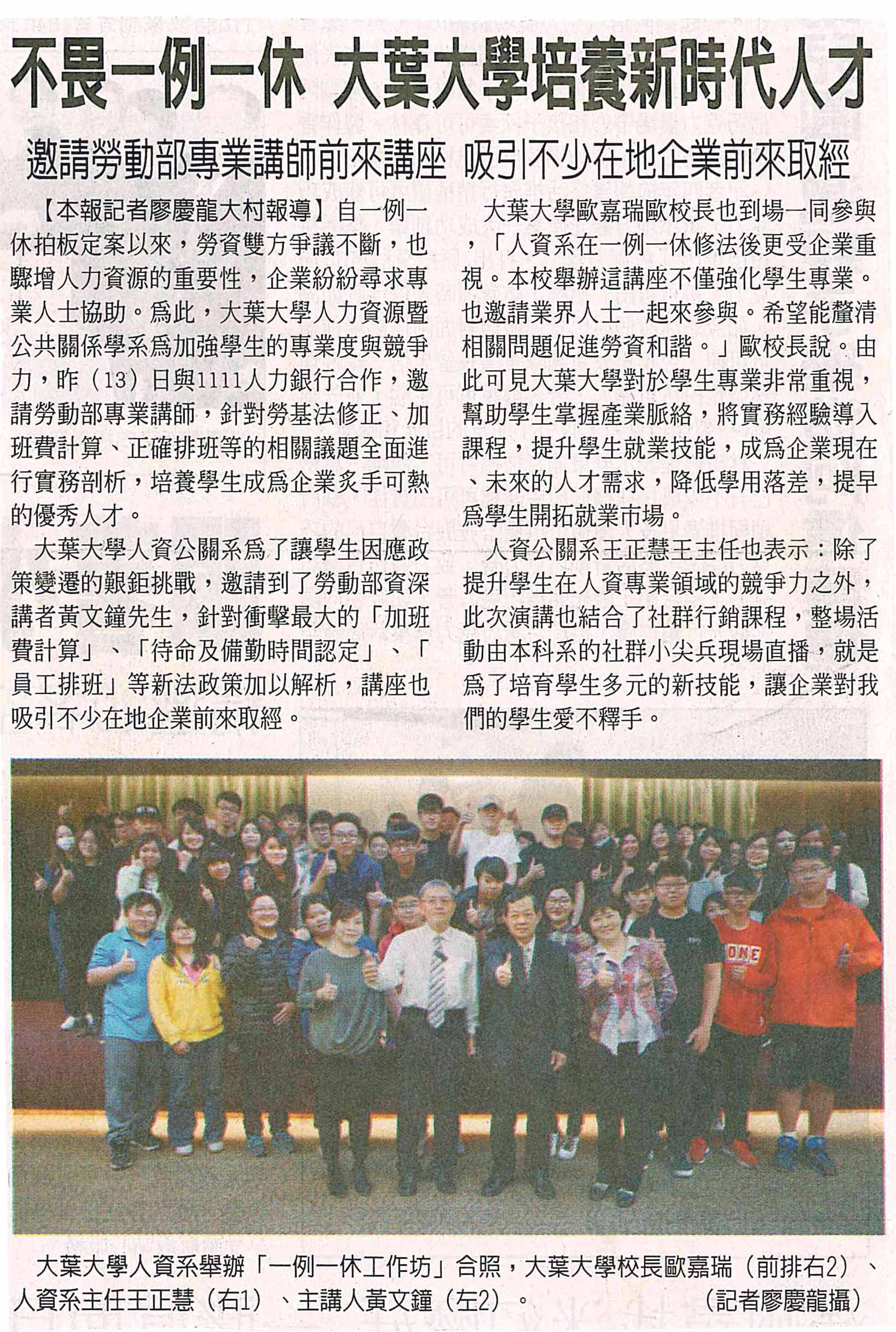 不畏一例一休 大葉大學培養新時代人才