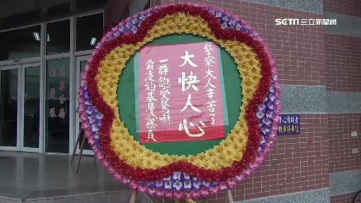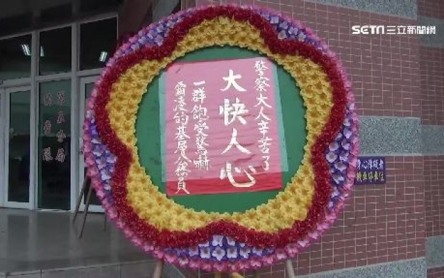 收到熱情民眾送來花圈的,還有台南這家警局,一夜之間門口被擺上4個花圈,上頭就寫著「大快人心,警察辛苦了」,不過花圈數量太多,讓當事人很傻眼。在彰化大葉大學外擺上這排一共32個花圈,長達100多公尺,讓壽星又驚又喜,壽星陳俊龍(2015.12.24):「突然睡醒之後,就一排花圈這樣,很錯愕說什麼那是不是我啊?」
