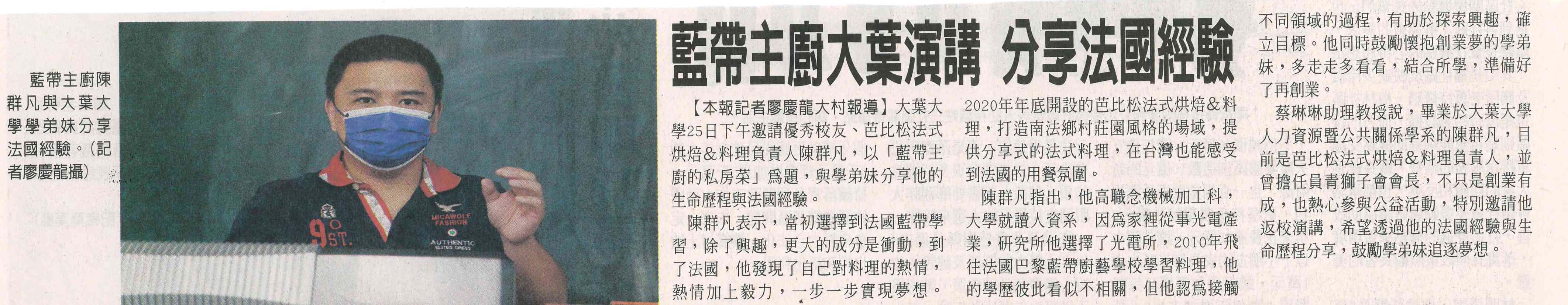 下一則:大葉邀藍帶主廚分享法國經驗 鼓勵學弟妹追逐夢想
